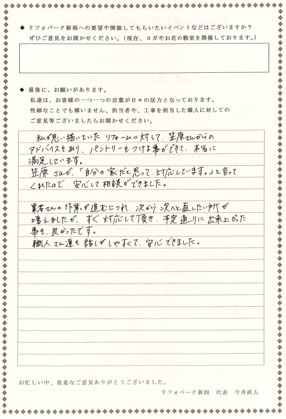 江南区 B様の声 「自分の家だと思って対応しています」との言葉に安心して相談ができました 総合評価 100/100点満点中 お気づきの点、ご意見、ご感想をお聞かせ下さい 私が思い描いていたリフォームに対して、笠原さんからのアドバイスもあり、パントリーもつける事ができて、本当に満足しています。 笠原さんが「自分の家だと思って対応しています」と言ってくれたので。安心して相談ができました。 業者さんの作業が進むにつれ、次から次へと直したい所が増えましたが、すぐ対応して頂き、予定通りに出来上がった事も、良かったです。 職人さん達も話がしやすくて、安心できました。 ORDER このお客様の施工内容 キッチン 前の記事 次の記事 一覧へ戻る