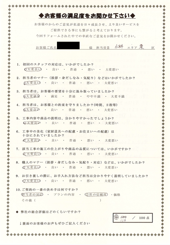 東区 A様の声 気配りのある丁寧なお仕事で安心してお任せできました 総合評価 100/100点満点中 お気付きの点やご意見、ご感想をお聞かせ下さい この度は給湯器工事を寒い中設置して下さりありがとうございました。 昨年より何度も足を運んで頂き、些細な事、疑問に思うことに 丁寧に答えて下さり心強く感じました。 また年末休み直前には心配して駆けつけ見て下さり本当に安心できました。 いつもいつも笑顔で接して下さり嬉しかったです。 これからも宜しくお願い致します。 リフォパークスタッフの皆様はいつも気持ち良く対応して下さり 寄り添って下さるので頼りになります。 また気配りのある丁寧なお仕事で安心してお任せできました。 ありがとうございました。 前の記事 一覧へ戻る